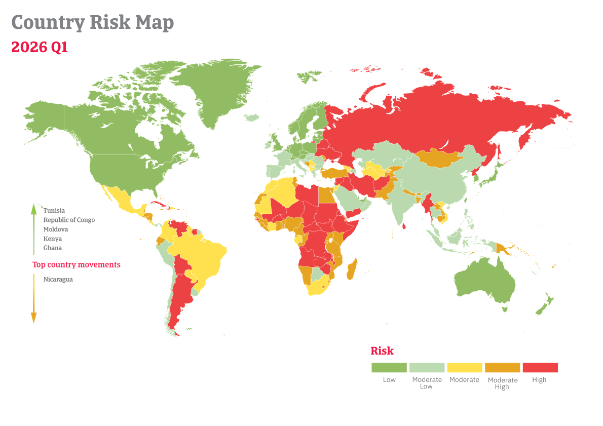 The changes reflect conditions at the end of Q1 2026, with upgrades for Ghana, Kenya, Moldova, the Republic of the Congo and Tunisia, and a downgrade for Nicaragua.